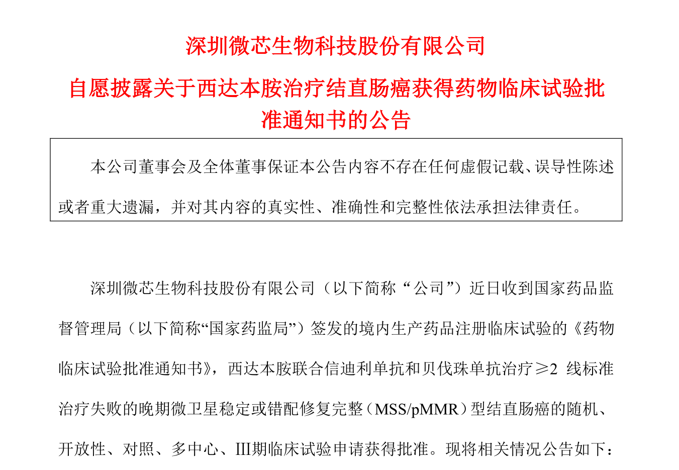 7月23日盤後,《深圳微芯生物科技股份有限公司自願披露關於西達本胺治療結直腸癌獲得藥物臨床試驗批準通知書的公告》發布。