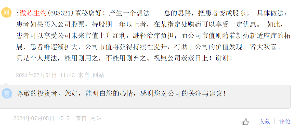 7月1日,有投資者在互動平台向微芯生物提問:董秘您好!產生一個想法——總的思路,把患者變成股東。 具體做法:患者如果買入公司股票,持股期一年以上者,在某指定處購藥可以享受一定優惠。 如此,患者可以享受公司未來市值上升紅利,減輕治療負擔;而公司市值則隨著新藥新適應症的拓展、患者群逐漸擴大,公司市值將獲得持續性提升,有助於公司的價值發現。皆大歡喜。 隻是個人想法,能用則用之,不能用則棄之。祝願公司蒸蒸日上!謝謝!