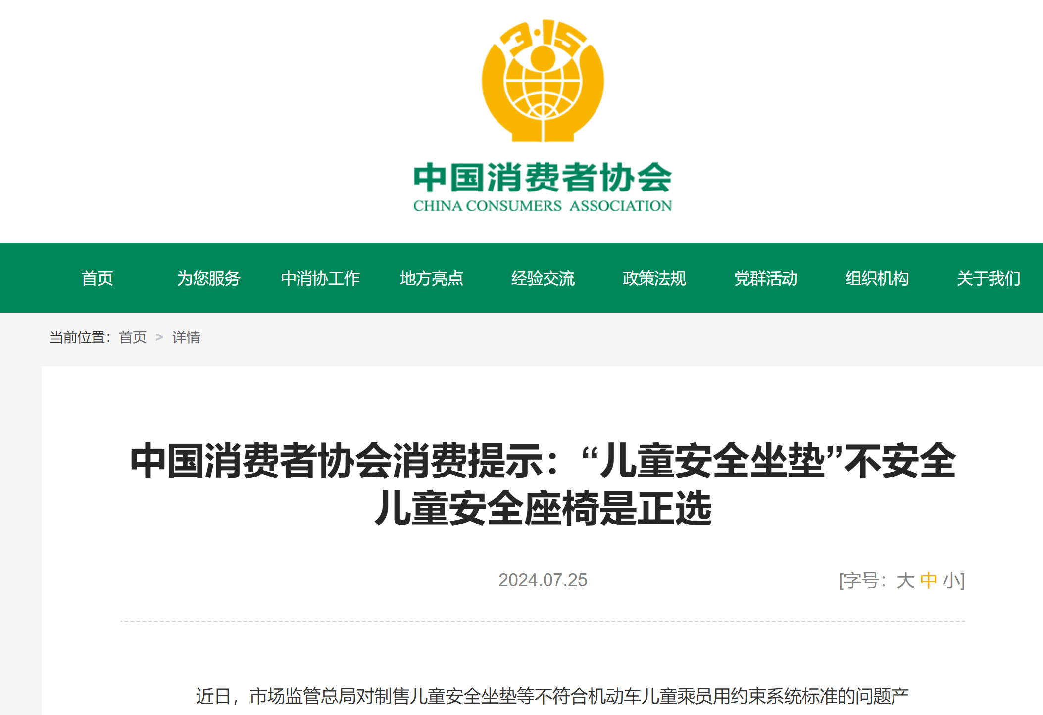 7月25日,記者從中國消費者協會(簡稱“中消協”)官網獲悉,中國消費者協會發布消費提示:“兒童安全坐墊”不安全,兒童安全座椅是正選。