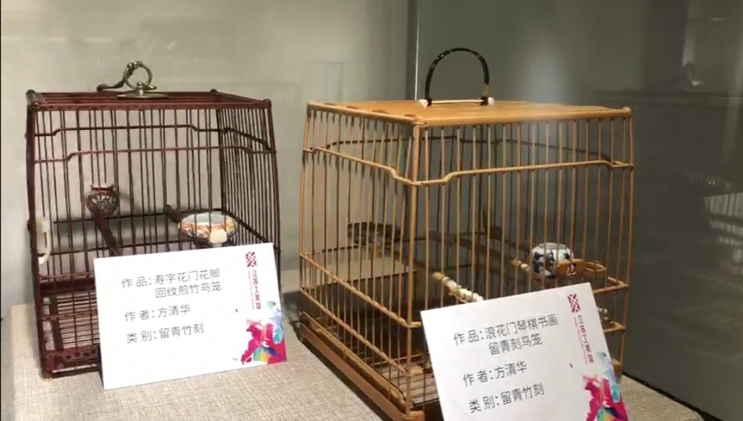 走進展館,香爐、筆洗,漆器、根雕、木雕、紫砂茶具、織繡、剪紙……各種精妙絕倫的工藝品琳琅滿目、美不勝收,讓來此參觀的遊客讚聲不絕。記者看到,展館裏,觀眾們三五成群的圍著這些工藝品拍照欣賞,不時發出讚歎聲,來自長三角地區的青年藝術家們也圍聚在一起,各自評點著對方的參賽作品,在展館一側,兩件留青竹刻的精致鳥籠吸引了一位老爺爺的注意,他說,自己家裏養了兩隻小鸚鵡,所以對鳥籠會特別關注一些,“這兩個鳥籠看似普普通通,但貴在精巧細致,我很喜歡。”