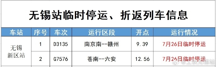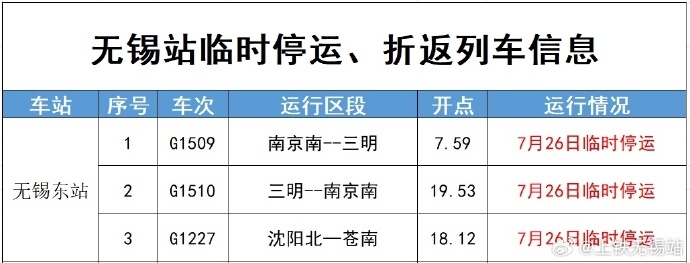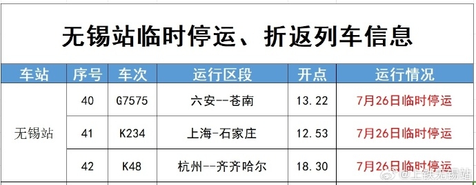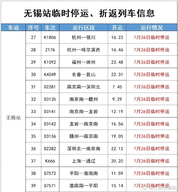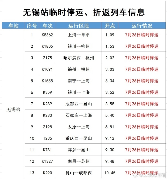 記者剛剛從上海鐵路局無錫站(下稱:鐵路無錫站)獲悉,受台風“格美”影響,鐵路無錫站26日將停運部分列車(見附圖)。
