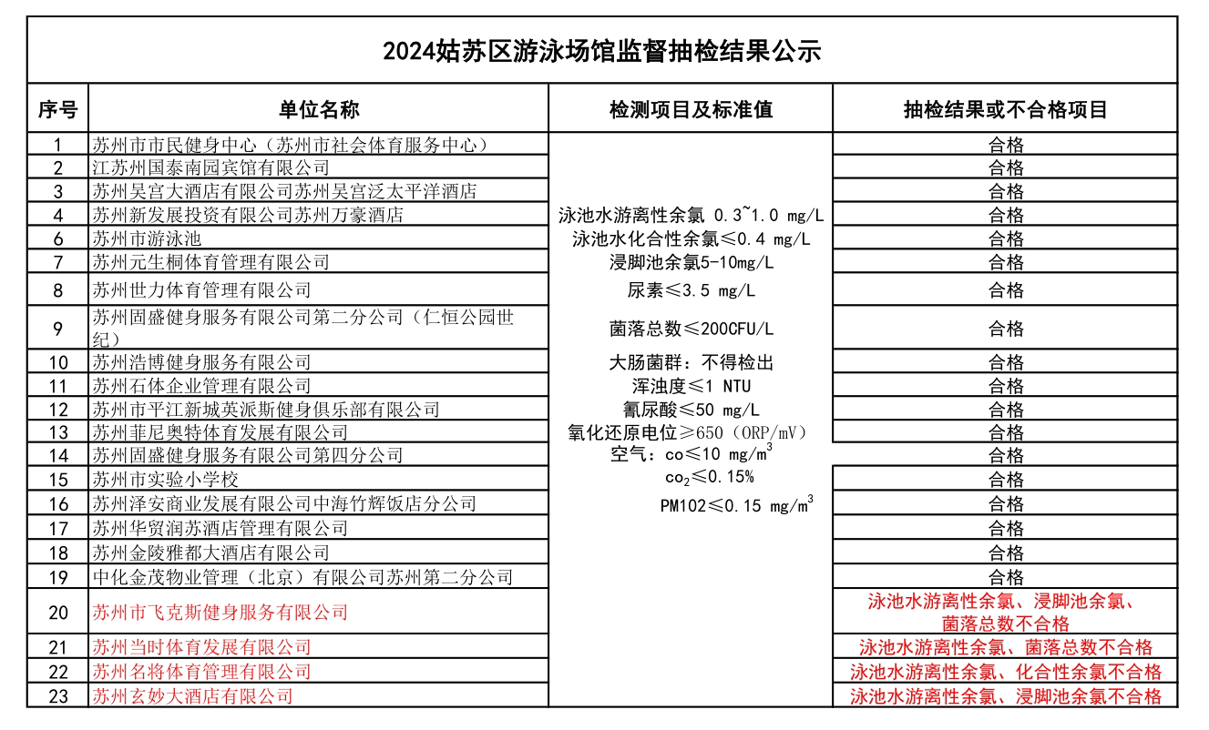 今年蘇城的三伏天格外炎熱,推動了遊泳場館消費的增長,特別是暑期來臨,大量青少年群體湧入泳池,泳館迎來了一年中的消費最旺季,同時也是衛生管理的高壓期。近日,亚博体育 彩票 市姑蘇區衛生監督所開展了轄區遊泳場館的專項監督抽檢,共涉及23家遊泳場館,按照GB37488-2019《公共場所衛生指標及限值要求》,對空氣質量,泳池水pH值、遊離性餘氯、化合性餘氯、尿素、菌落總數、大腸菌群、渾濁度、氰尿酸,浸腳池餘氯等項目進行了檢測,其中19家場館合格,合格率為83%。