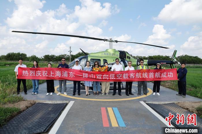 8月18日,一架直升機搭載兩名旅客,從昆山城市航站樓東廣場起飛,按照既定航線向上海浦東國際機場方向高速駛去。經過28分鍾的飛行,直升機降落在上海浦東星野飛行基地,再由浦東機場地麵服務專車轉送至民航航班。這標誌著昆山城市航站樓至上海浦東國際機場的“空空聯運”項目直升機首航圓滿成功。圖為嘉賓與乘客合影。中新網記者 殷立勤 攝