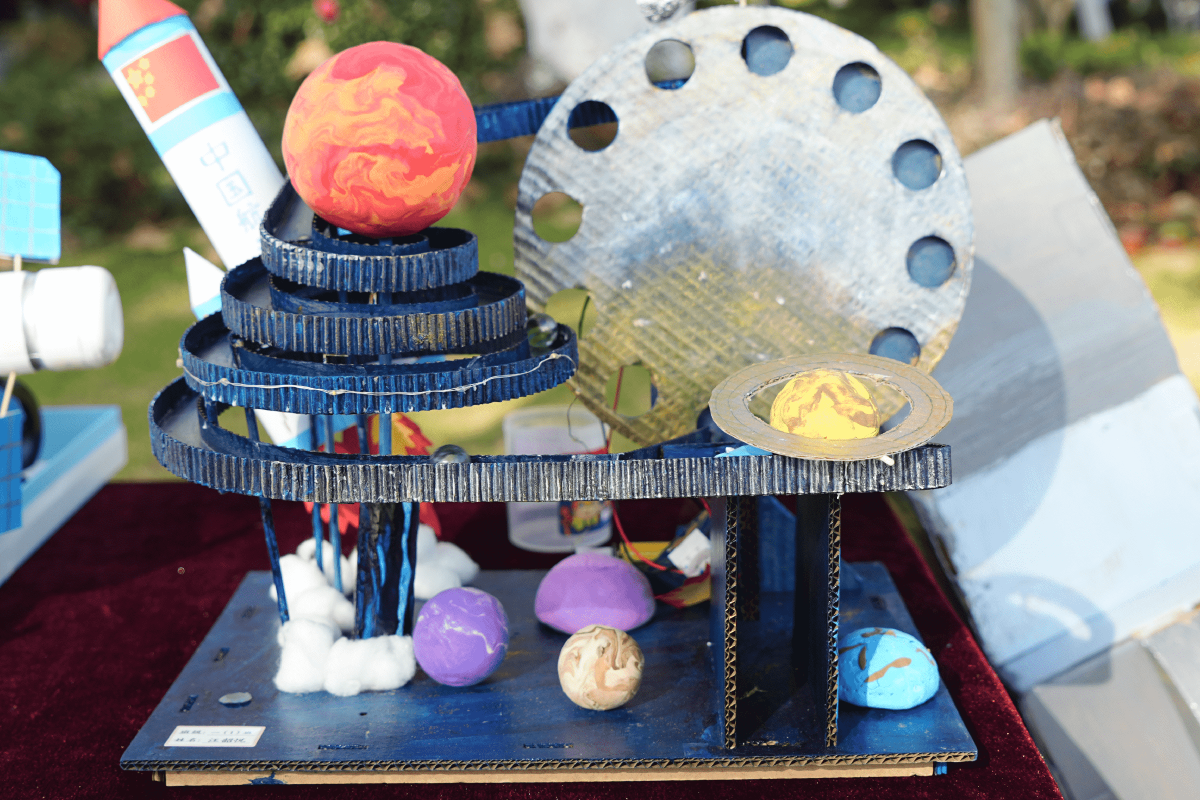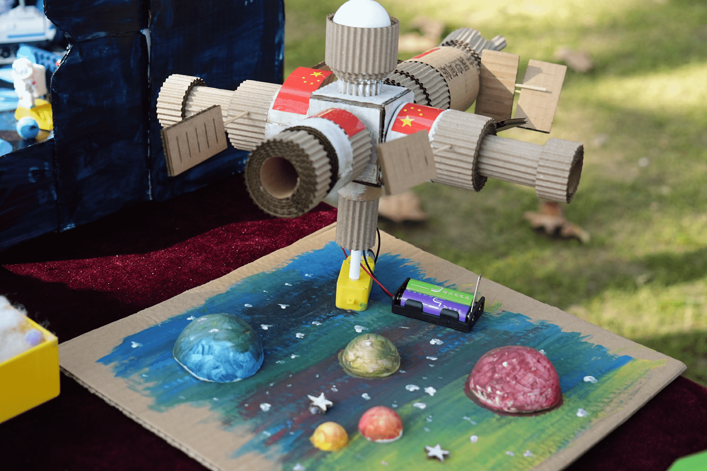 坦克、空間站、火箭助推器……現場展示出了同學們製作的“大國重器”模型。廢紙板、棉花,甚至是樹葉都可以成為原材料。“我們不斷實驗,第3版降落傘縮小了傘麵麵積,達到了15秒降落標準。”小營學子不僅動手能力超強,他們自己研究,不斷探索國防科技裝備的奧秘。