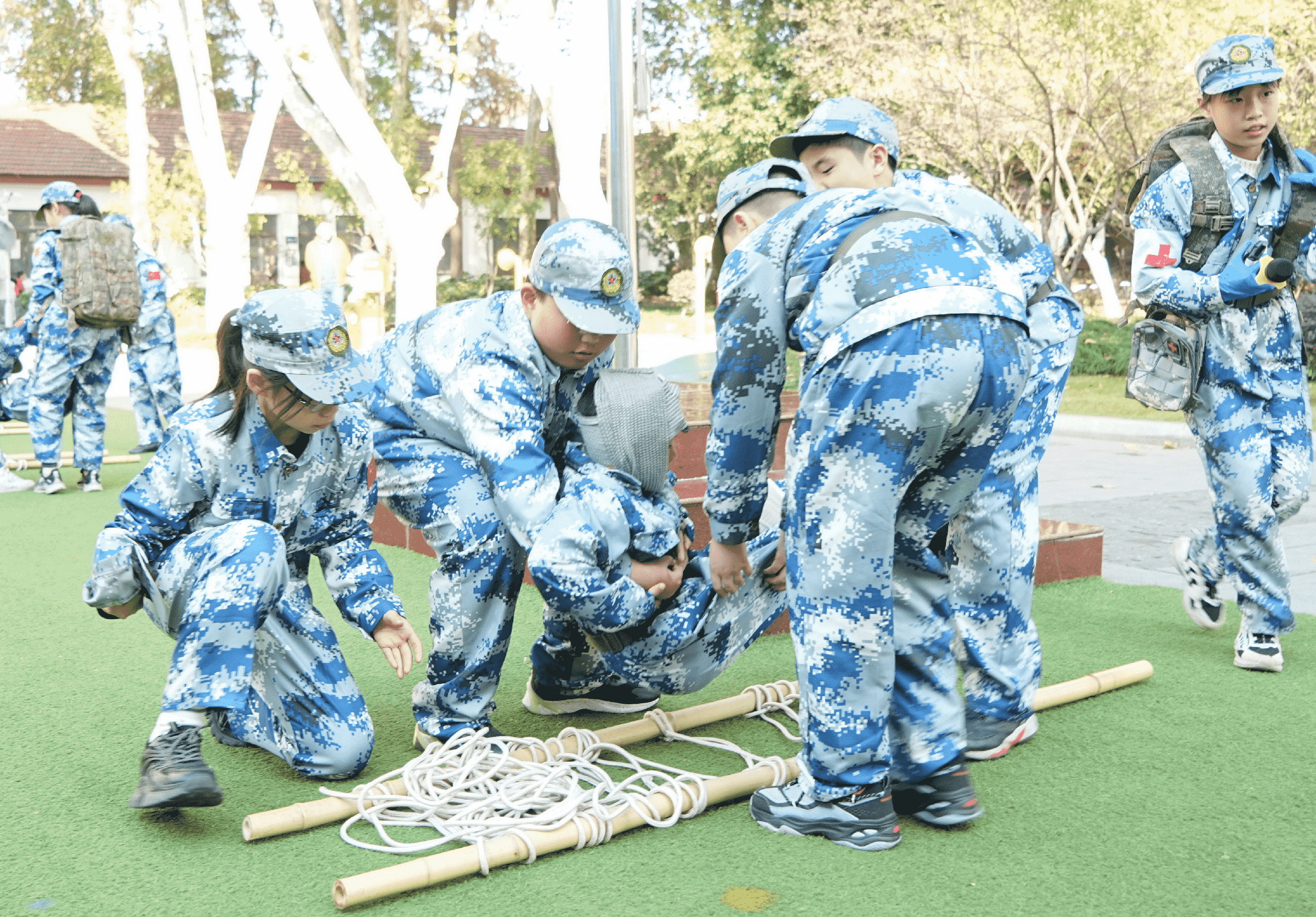 “報告!前線有人受傷,請求救援!”廣場上,一場緊張的模擬“傷員救治”正在展開。搭帳篷做擔架,無人機偵察之後,由同學們扮演的救援隊員們穿過重重障礙抵達“傷員”身邊,用嫻熟的手法為傷員進行包紮,救援任務順利完成。