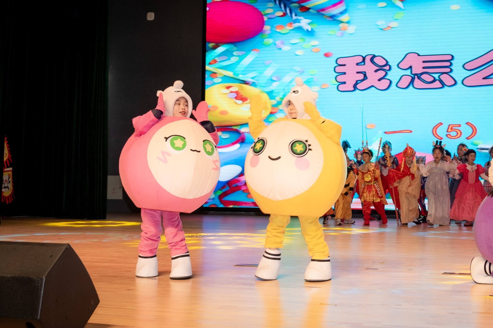 全場尖叫聲最多、掌聲最響的當屬一(5)班和一(6)班的走秀表演《我怎麼這麼好看》。這場集齊了童年“頂流”的COS(角色扮演)走秀,自帶“燃點”和“爆點”。從“奧特曼”出場的那一刻,別說孩子們,就連記者都深受感染,“應援聲”最大的男孩子們有的甚至激動得跳了起來;“冰雪奇緣”COS組合則收獲了女孩子們的尖叫;《西遊記》的“唐僧師徒”一出場,台下孩子們開始熱烈地討論;“蛋仔派對”激萌出場,大的小的黃的粉的各種花色“蛋仔”任你pick,引得全場大呼“可愛”。走秀表演是短暫的,孩子們“追星”的心卻很堅定,童年“頂流”們即使下場也擁有讓全場視線跟隨的魔力。
