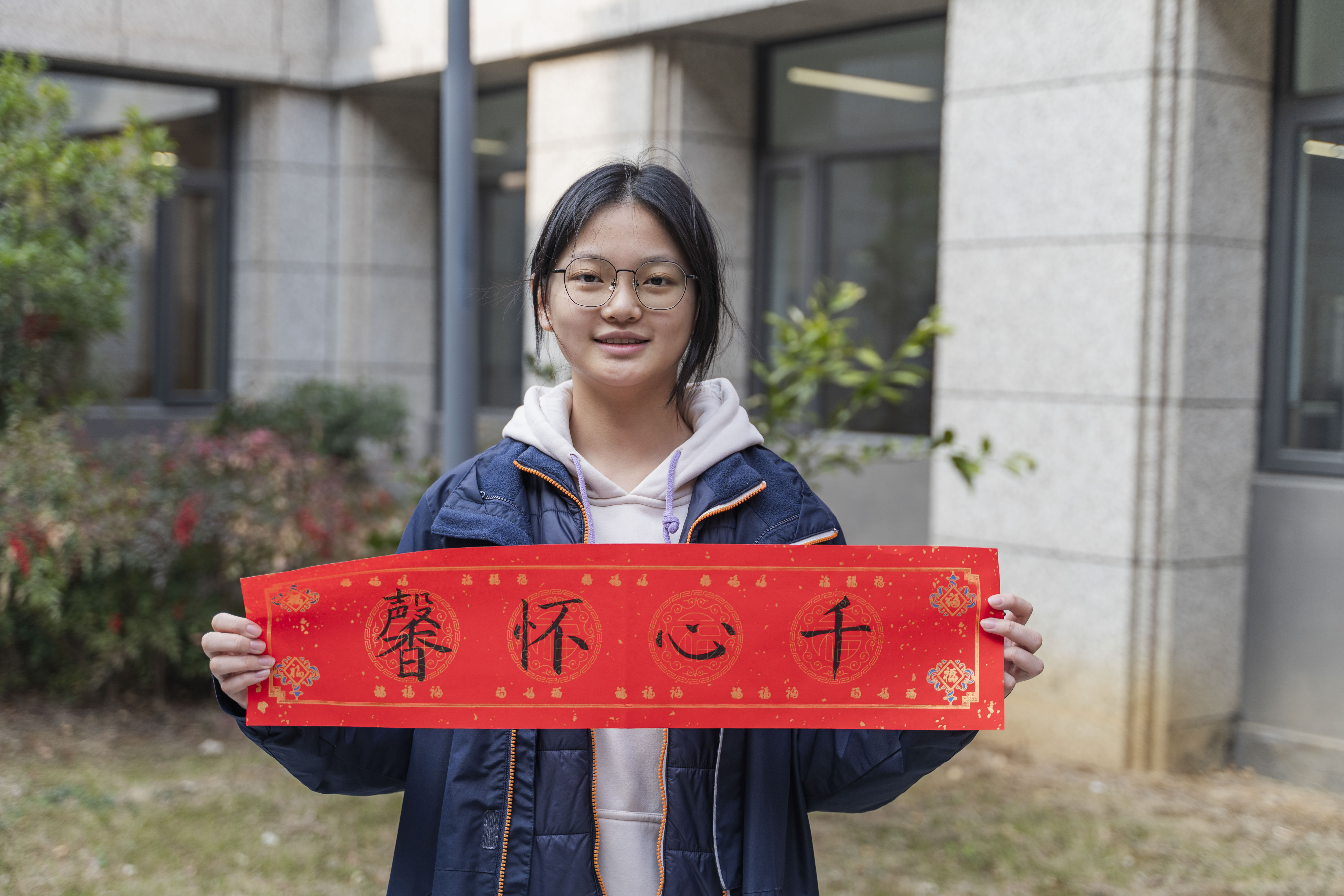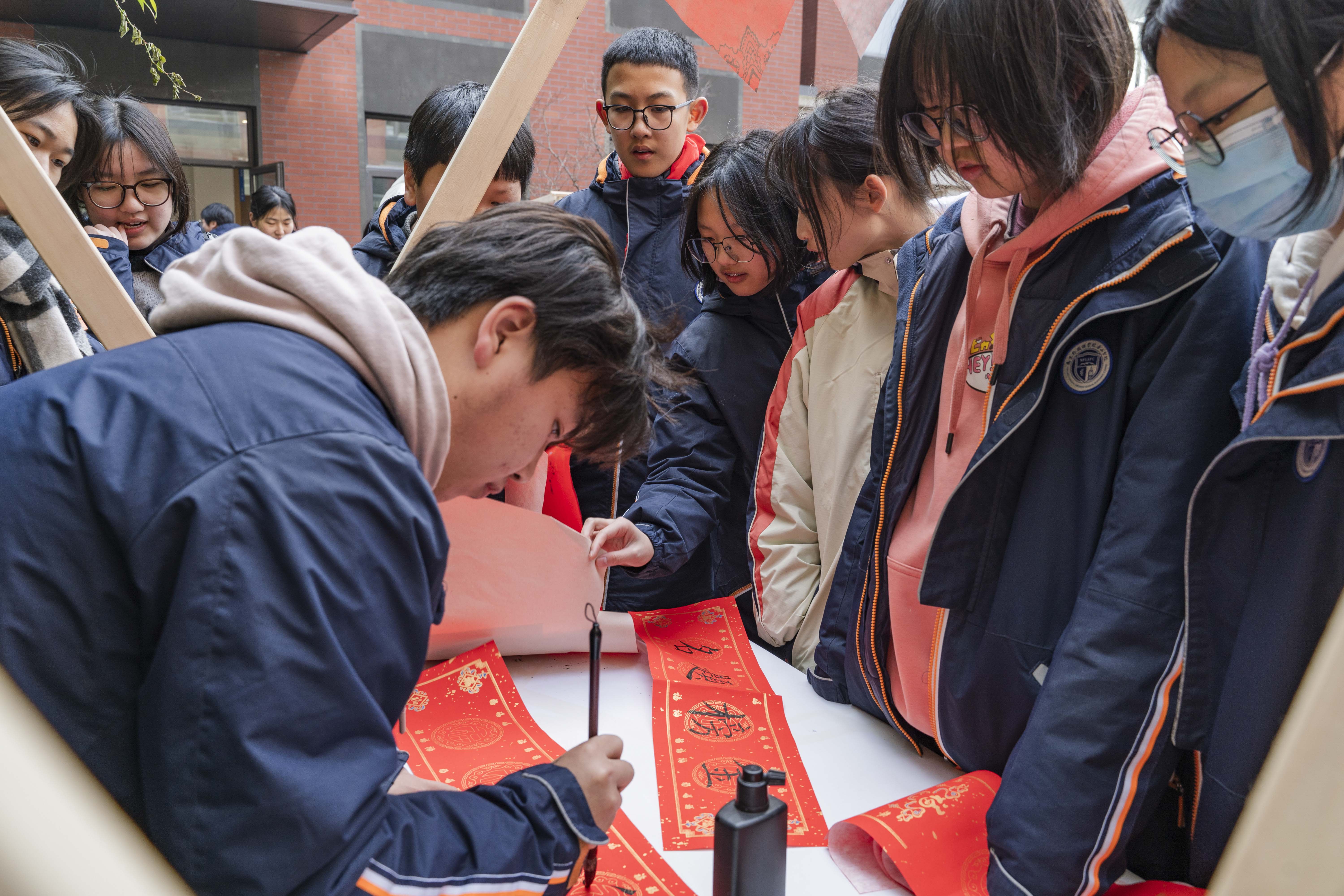 午後的科技高中庭院裏人頭攢動,“雲的南方”方圓造物師生美術作品展正在這裏展出。同學們閑庭信步,時而駐足竹林邊,欣賞庭院中的書畫作品,時而擠進熱鬧的春聯攤位,獲得一幅喜慶的新春對聯。