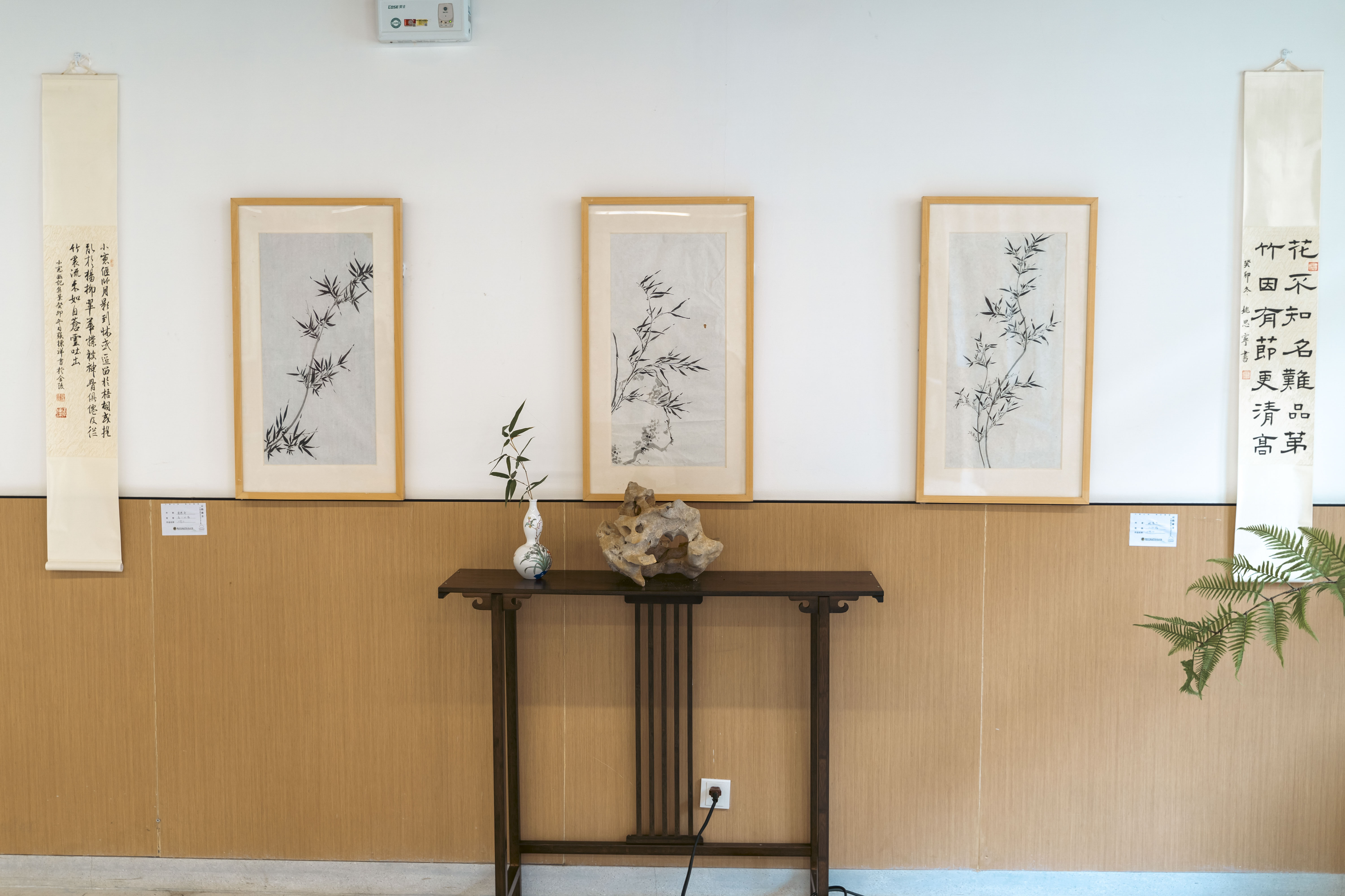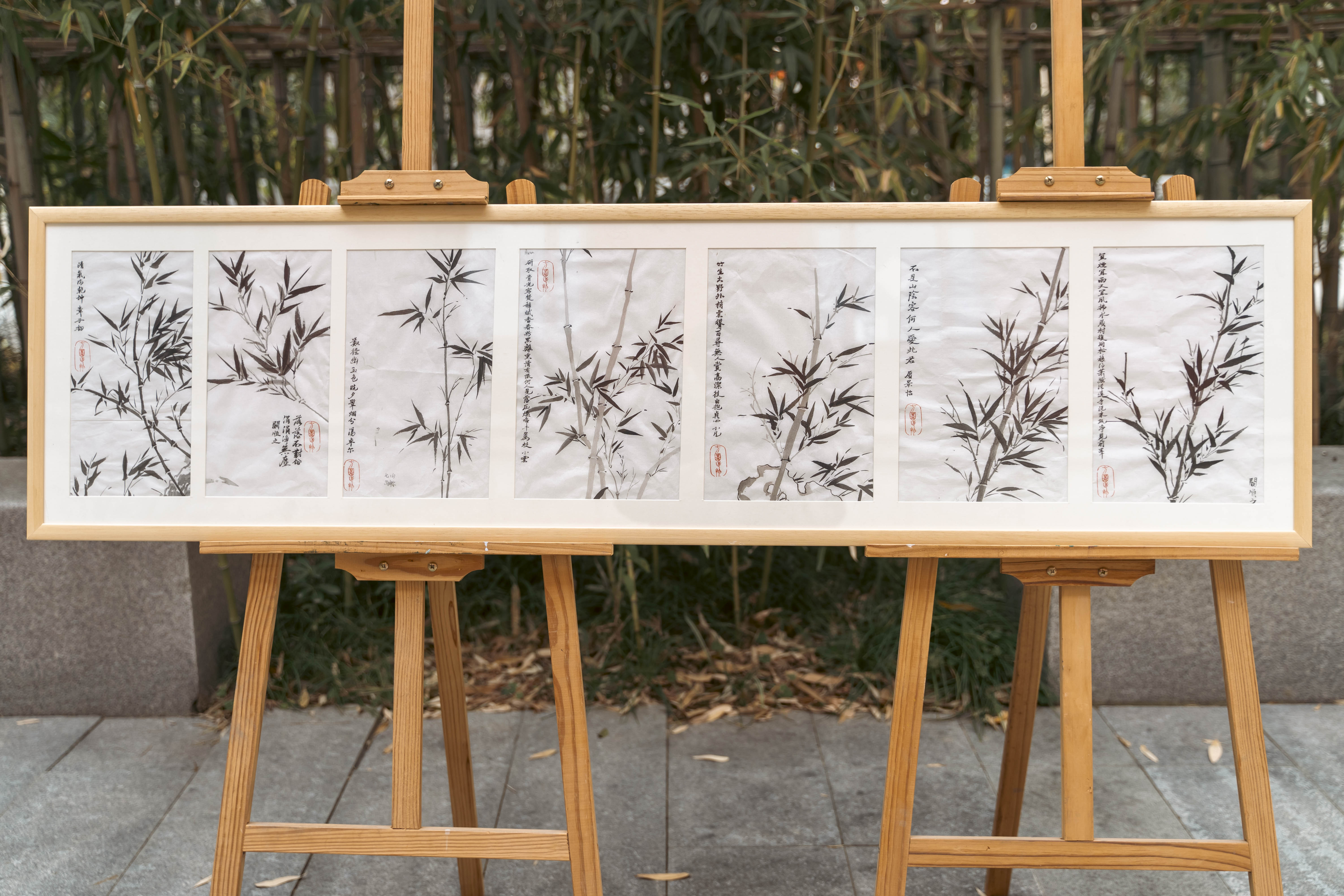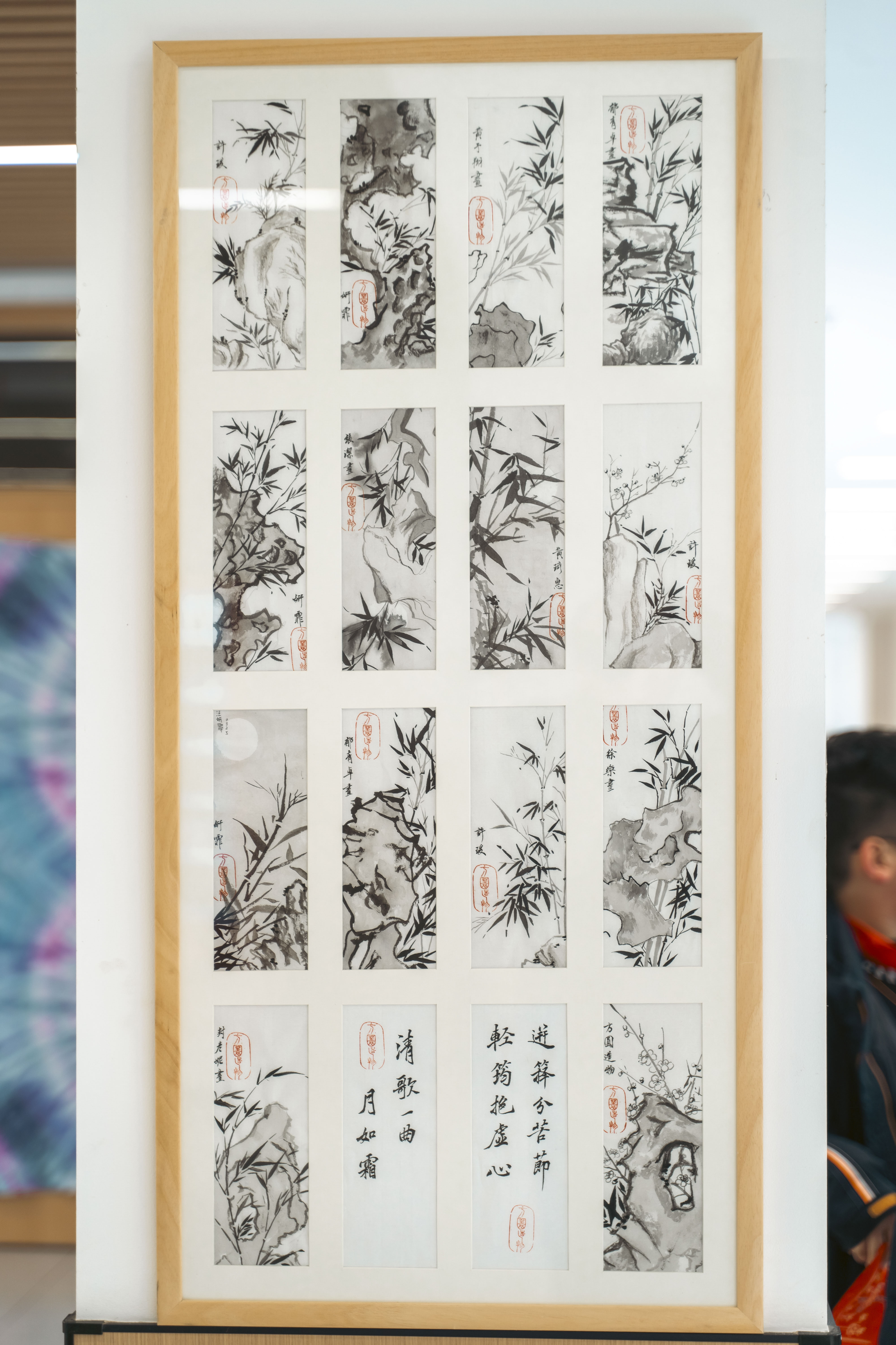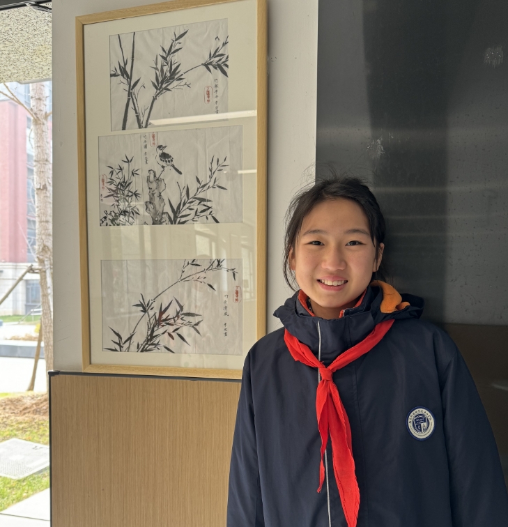 初一學生胡孝恩此次有三幅墨竹畫展出。“我學習水墨畫已經五年了。進入方山學習後,在美術課上我就能得到老師們的指導,並且有更多機會展示自我,讓我感到自己又有了突破。這次畫墨竹,我特地跑到高中部來觀察竹子,在過程中也感受到竹子堅韌不拔的品質。”